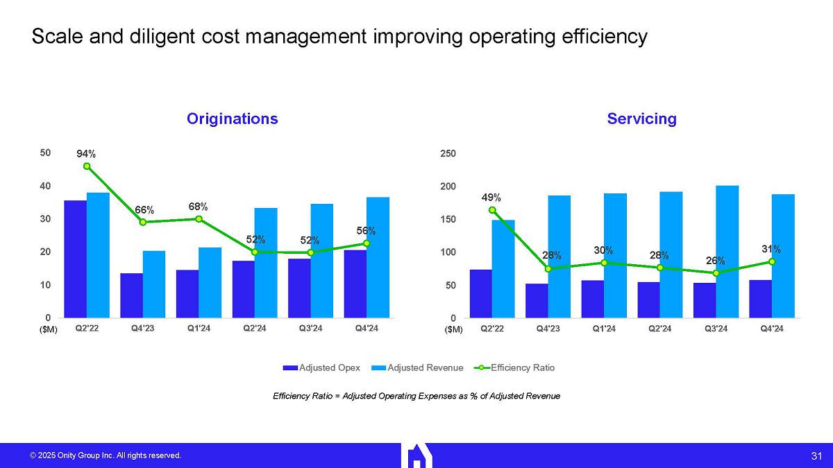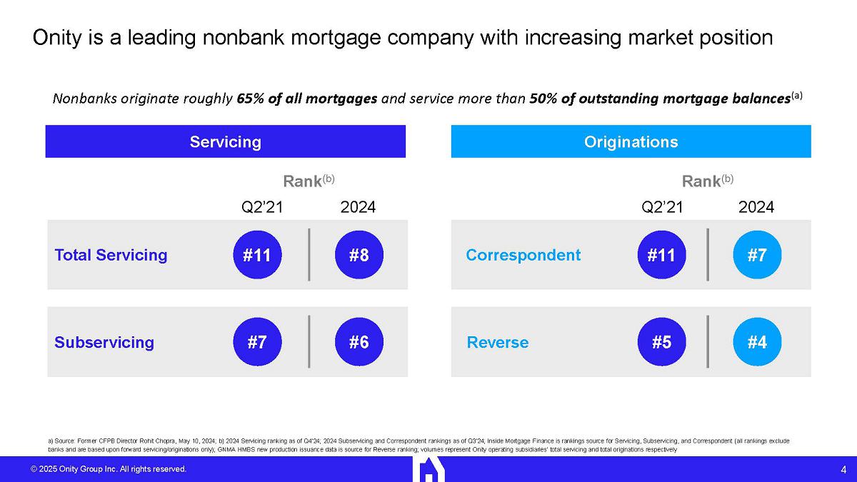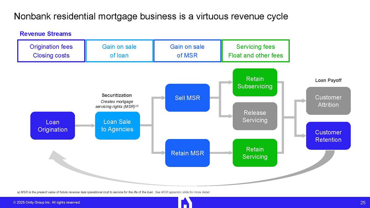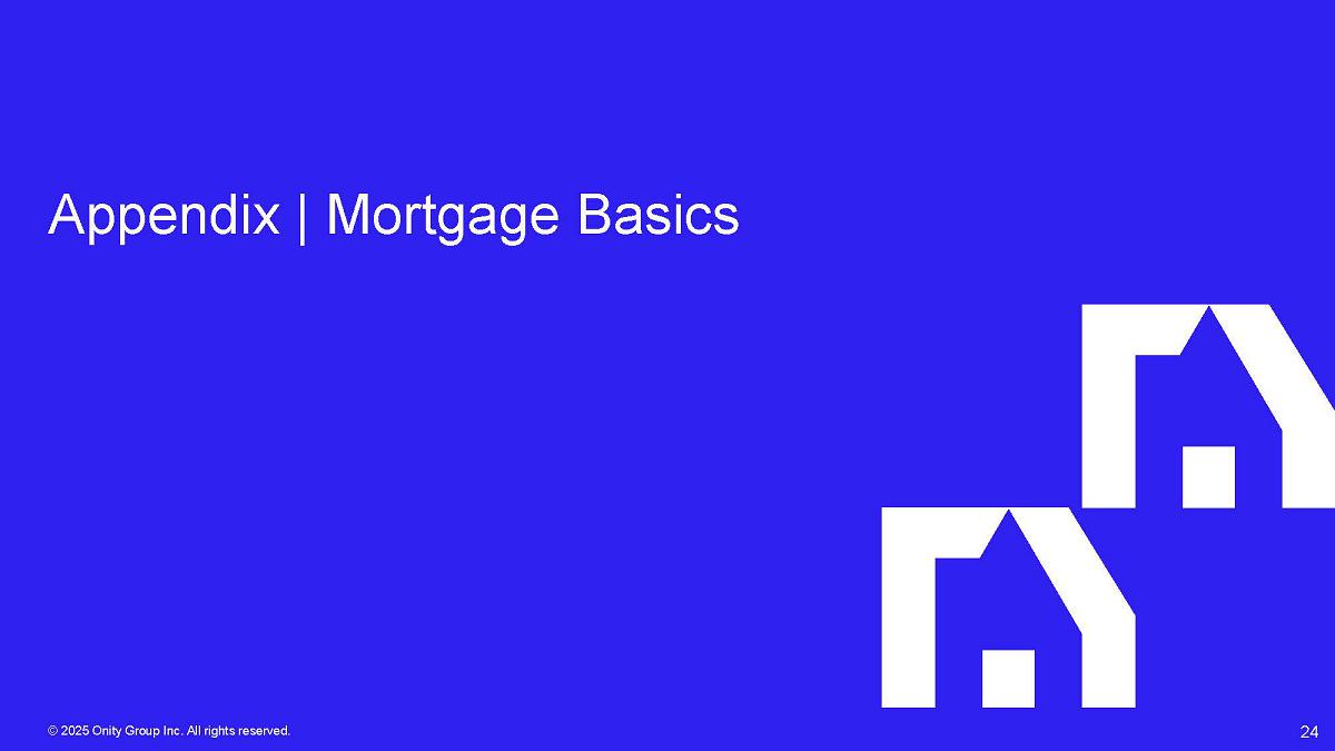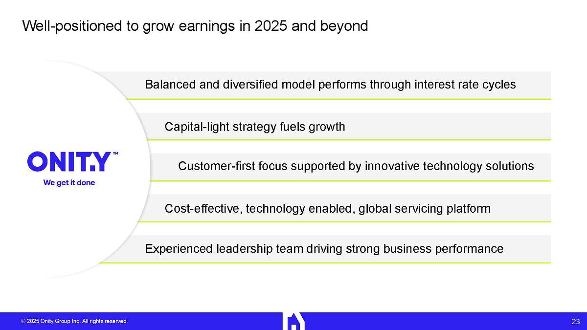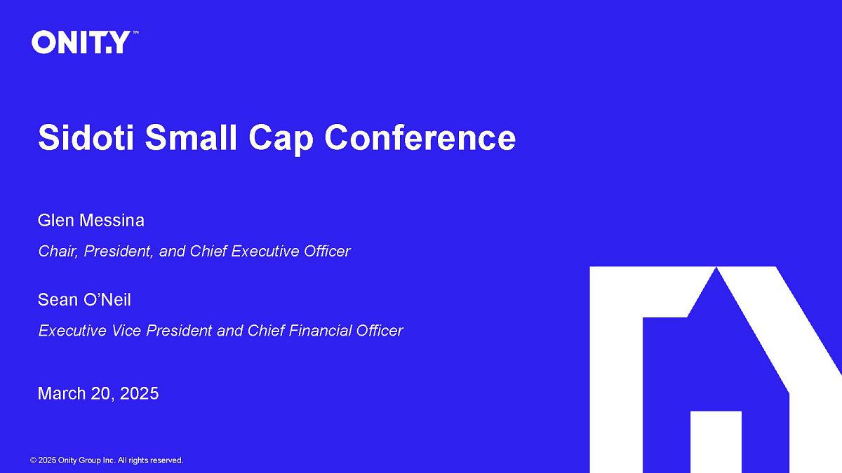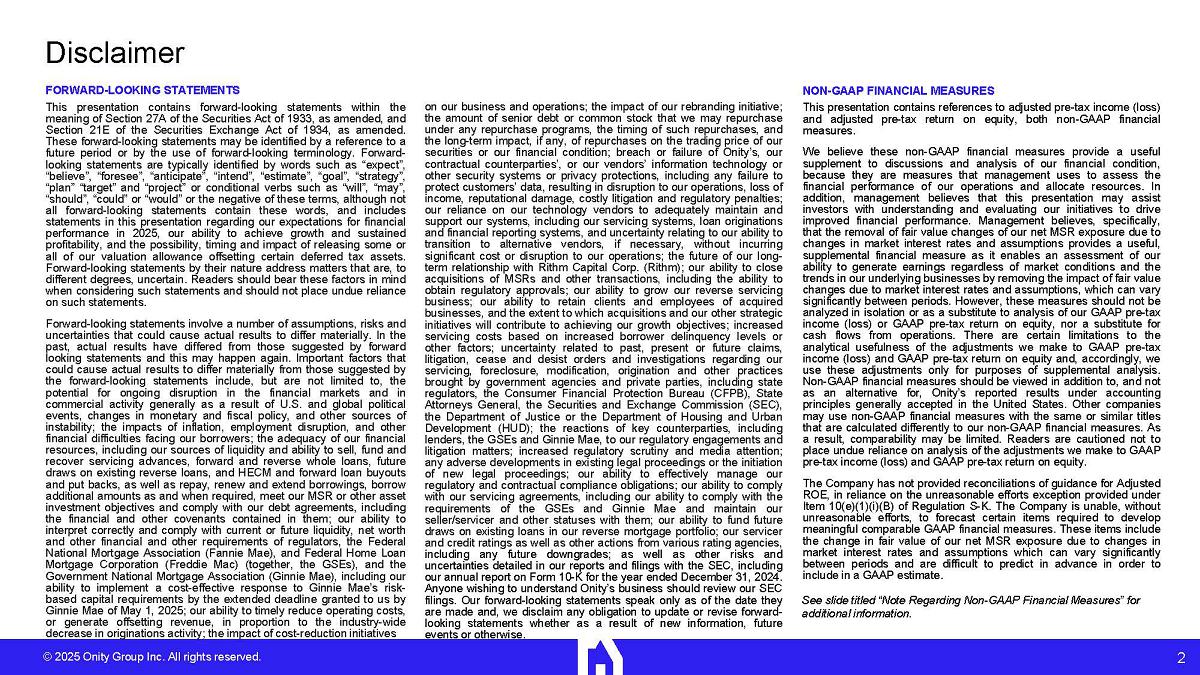 Forward-looking statements involve a number of assumptions, risks and uncertainties that could cause actual results to differ materially. In the past, actual results have differed from those suggested by forward looking statements and this may happen again. Important factors that could cause actual results to differ materially from those suggested by the forward-looking statements include, but are not limited to, the potential for ongoing disruption in the financial markets and in commercial activity generally as a result of U.S. and global political events, changes in monetary and fiscal policy, and other sources of instability; the impacts of inflation, employment disruption, and other financial difficulties facing our borrowers; the adequacy of our financial resources, including our sources of liquidity and ability to sell, fund and recover servicing advances, forward and reverse whole loans, future draws on existing reverse loans, and HECM and forward loan buyouts and put backs, as well as repay, renew and extend borrowings, borrow additional amounts as and when required, meet our MSR or other asset investment objectives and comply with our debt agreements, including the financial and other covenants contained in them; our ability to interpret correctly and comply with current or future liquidity, net worth and other financial and other requirements of regulators, the Federal National Mortgage Association (Fannie Mae), and Federal Home Loan Mortgage Corporation (Freddie Mac) (together, the GSEs), and the Government National Mortgage Association (Ginnie Mae), including our ability to implement a cost-effective response to Ginnie Mae’s risk-based capital requirements by the extended deadline granted to us by Ginnie Mae of September 30, 2025; our ability to timely reduce operating costs, or generate offsetting revenue, in proportion to the industry-wide decrease in originations activity; the impact of cost-reduction initiatives on our business and operations; the impact of our rebranding initiative; the amount of senior debt or common stock or that we may repurchase under any repurchase programs, the timing of such repurchases, and the long-term impact, if any, of repurchases on the trading price of our securities or our financial condition; breach or failure of Onity’s, our contractual counterparties’, or our vendors’ information technology or other security systems or privacy protections, including any failure to protect customers’ data, resulting in disruption to our operations, loss of income, reputational damage, costly litigation and regulatory penalties; our reliance on our technology vendors to adequately maintain and support our systems, including our servicing systems, loan originations and financial reporting systems, and uncertainty relating to our ability to transition to alternative vendors, if necessary, without incurring significant cost or disruption to our operations; the future of our long-term relationship with Rithm Capital Corp. (Rithm); our ability to close acquisitions of MSRs and other transactions, including the ability to obtain regulatory approvals; our ability to grow our reverse servicing business; our ability to retain clients and employees of acquired businesses, and the extent to which acquisitions and our other strategic initiatives will contribute to achieving our growth objectives; increased servicing costs based on increased borrower delinquency levels or other factors; uncertainty related to past, present or future claims, litigation, cease and desist orders and investigations regarding our servicing, foreclosure, modification, origination and other practices brought by government agencies and private parties, including state regulators, the Consumer Financial Protection Bureau (CFPB), State Attorneys General, the Securities and Exchange Commission (SEC), the Department of Justice or the Department of Housing and Urban Development (HUD); the reactions of key counterparties, including lenders, the GSEs and Ginnie Mae, to our regulatory engagements and litigation matters; increased regulatory scrutiny and media attention; any adverse developments in existing legal proceedings or the initiation of new legal proceedings; our ability to effectively manage our regulatory and contractual compliance obligations; our ability to comply with our servicing agreements, including our ability to comply with the requirements of the GSEs and Ginnie Mae and maintain our seller/servicer and other statuses with them; our ability to fund future draws on existing loans in our reverse mortgage portfolio; our servicer and credit ratings as well as other actions from various rating agencies, including any future downgrades; as well as other risks and uncertainties detailed in our reports and filings with the SEC, including our annual report on Form 10-K for the year ended December 31, 2024. Anyone wishing to understand Onity’s business should review our SEC filings. Our forward-looking statements speak only as of the date they are made and, we disclaim any obligation to update or revise forward-looking statements whether as a result of new information, future events or otherwise.