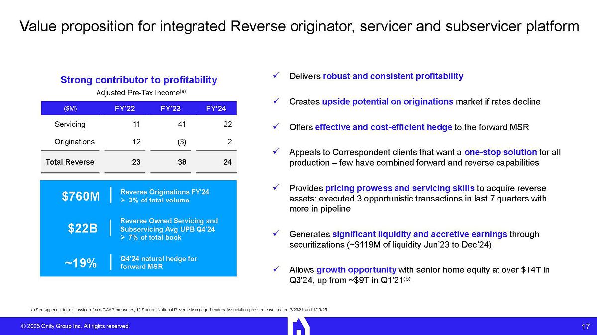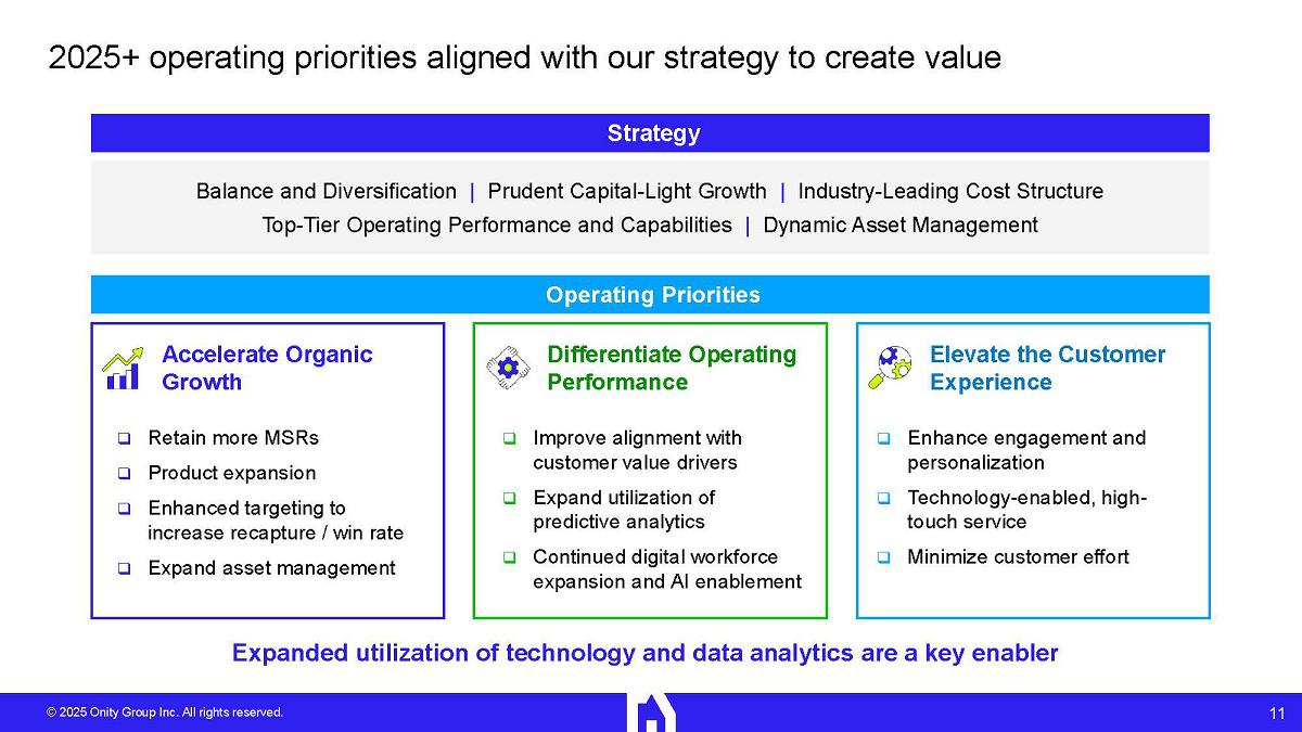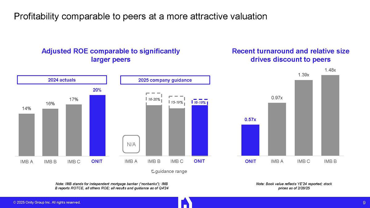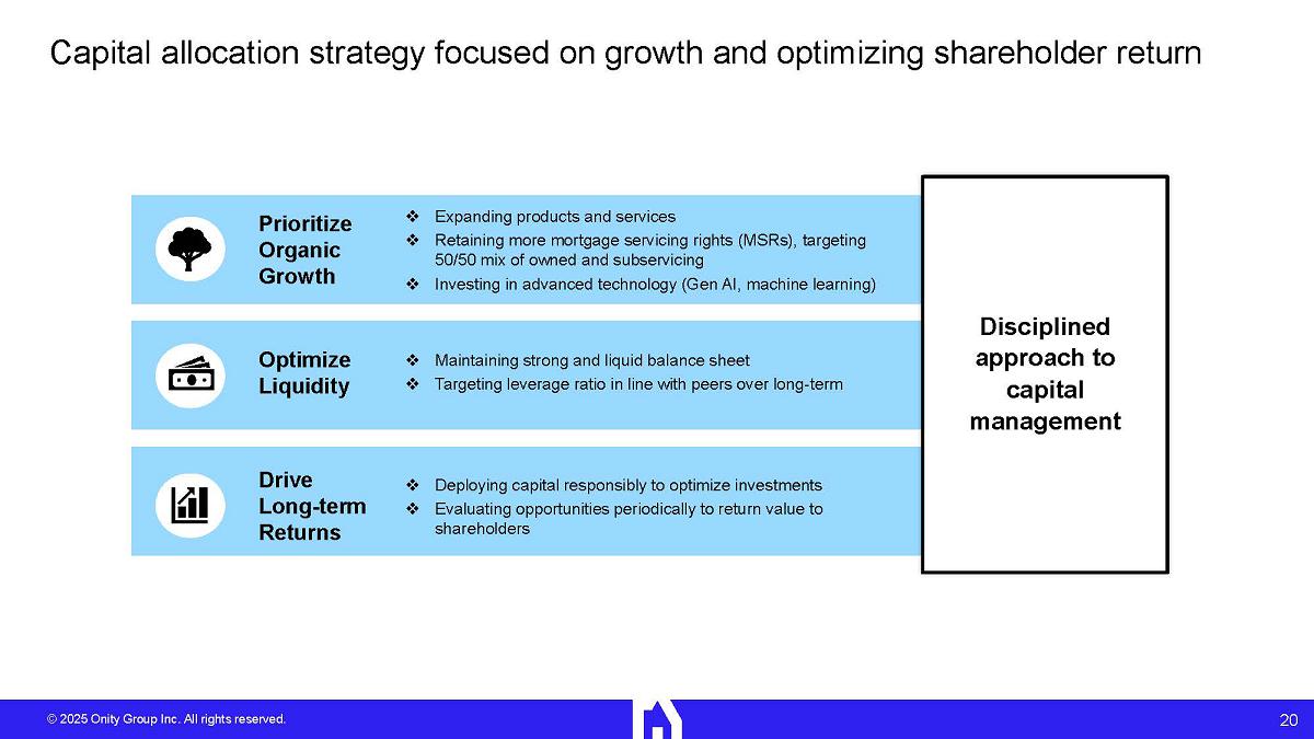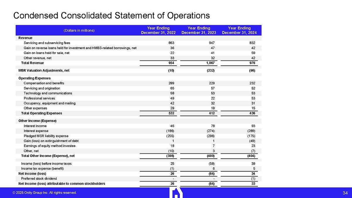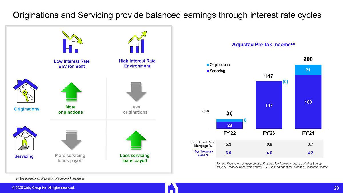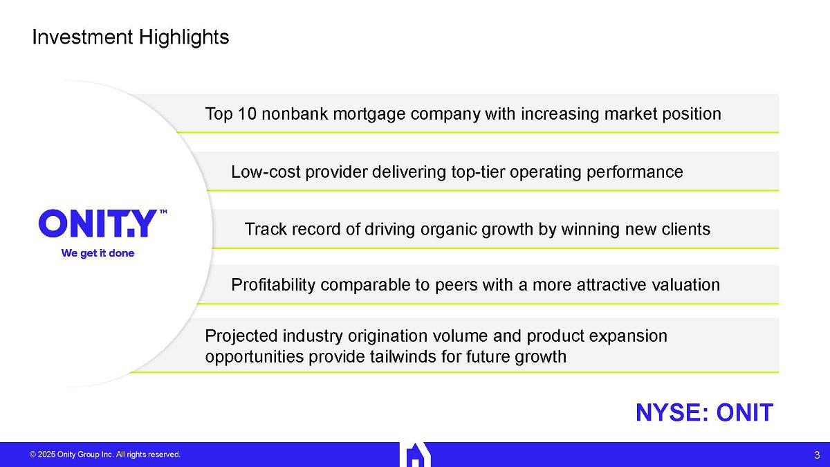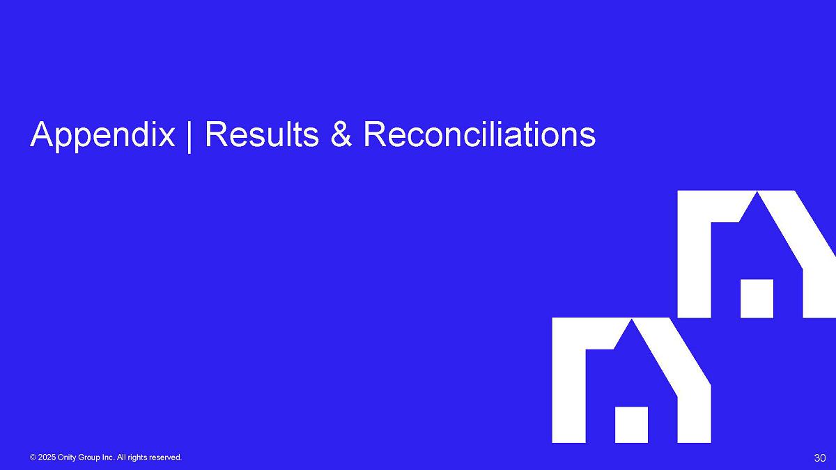 Forward-looking statements involve a number of assumptions, risks and uncertainties that could cause actual results to differ materially. In the past, actual results have differed from those suggested by forward looking statements and this may happen again. Important factors that could cause actual results to differ materially from those suggested by the forward-looking statements include, but are not limited to, the potential for ongoing disruption in the financial markets and in commercial activity generally as a result of U.S. and global political events, changes in monetary and fiscal policy, and other sources of instability; the impacts of inflation, employment disruption, and other financial difficulties facing our borrowers; the adequacy of our financial resources, including our sources of liquidity and ability to sell, fund and recover servicing advances, forward and reverse whole loans, future draws on existing reverse loans, and HECM and forward loan buyouts and put backs, as well as repay, renew and extend borrowings, borrow additional amounts as and when required, meet our MSR or other asset investment objectives and comply with our debt agreements, including the financial and other covenants contained in them; our ability to interpret correctly and comply with current or future liquidity, net worth and other financial and other requirements of regulators, the Federal National Mortgage Association (Fannie Mae), and Federal Home Loan Mortgage Corporation (Freddie Mac) (together, the GSEs), and the Government National Mortgage Association (Ginnie Mae), including our ability to implement a cost-effective response to Ginnie Mae’s risk-based capital requirements by the extended deadline granted to us by Ginnie Mae of September 30, 2025; our ability to timely reduce operating costs, or generate offsetting revenue, in proportion to the industry-wide decrease in originations activity; the impact of cost-reduction initiatives on our business and operations; the impact of our rebranding initiative; the amount of senior debt or common stock or that we may repurchase under any repurchase programs, the timing of such repurchases, and the long-term impact, if any, of repurchases on the trading price of our securities or our financial condition; breach or failure of Onity’s, our contractual counterparties’, or our vendors’ information technology or other security systems or privacy protections, including any failure to protect customers’ data, resulting in disruption to our operations, loss of income, reputational damage, costly litigation and regulatory penalties; our reliance on our technology vendors to adequately maintain and support our systems, including our servicing systems, loan originations and financial reporting systems, and uncertainty relating to our ability to transition to alternative vendors, if necessary, without incurring significant cost or disruption to our operations; the future of our long-term relationship with Rithm Capital Corp. (Rithm); our ability to close acquisitions of MSRs and other transactions, including the ability to obtain regulatory approvals; our ability to grow our reverse servicing business; our ability to retain clients and employees of acquired businesses, and the extent to which acquisitions and our other strategic initiatives will contribute to achieving our growth objectives; increased servicing costs based on increased borrower delinquency levels or other factors; uncertainty related to past, present or future claims, litigation, cease and desist orders and investigations regarding our servicing, foreclosure, modification, origination and other practices brought by government agencies and private parties, including state regulators, the Consumer Financial Protection Bureau (CFPB), State Attorneys General, the Securities and Exchange Commission (SEC), the Department of Justice or the Department of Housing and Urban Development (HUD); the reactions of key counterparties, including lenders, the GSEs and Ginnie Mae, to our regulatory engagements and litigation matters; increased regulatory scrutiny and media attention; any adverse developments in existing legal proceedings or the initiation of new legal proceedings; our ability to effectively manage our regulatory and contractual compliance obligations; our ability to comply with our servicing agreements, including our ability to comply with the requirements of the GSEs and Ginnie Mae and maintain our seller/servicer and other statuses with them; our ability to fund future draws on existing loans in our reverse mortgage portfolio; our servicer and credit ratings as well as other actions from various rating agencies, including any future downgrades; as well as other risks and uncertainties detailed in our reports and filings with the SEC, including our annual report on Form 10-K for the year ended December 31, 2024. Anyone wishing to understand Onity’s business should review our SEC filings. Our forward-looking statements speak only as of the date they are made and, we disclaim any obligation to update or revise forward-looking statements whether as a result of new information, future events or otherwise.