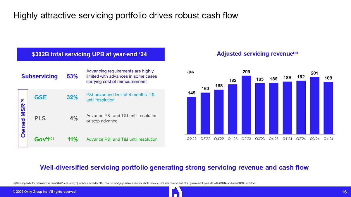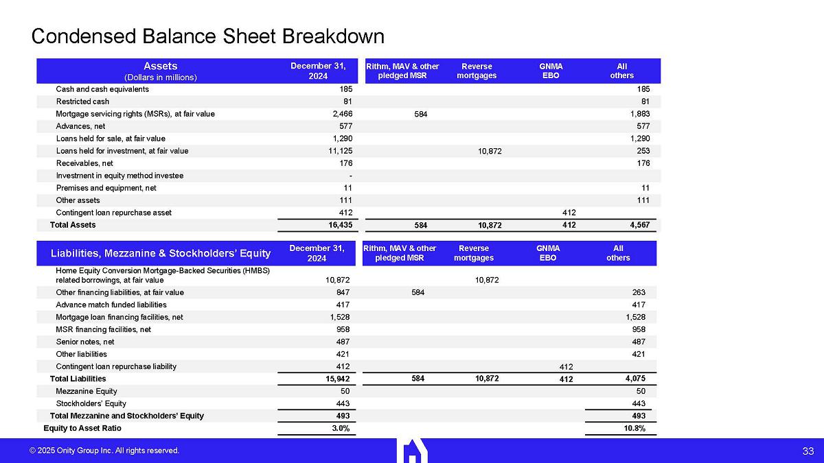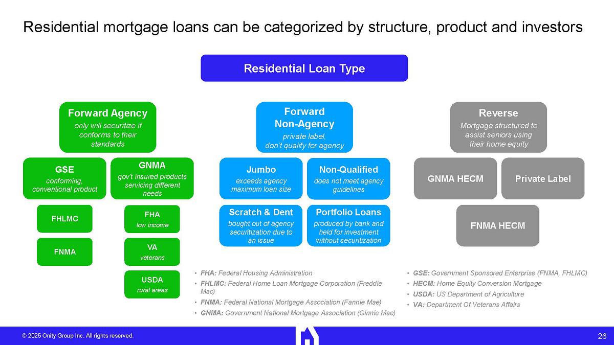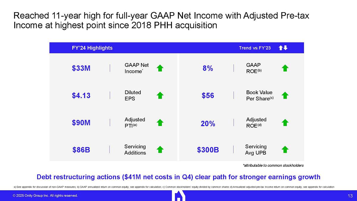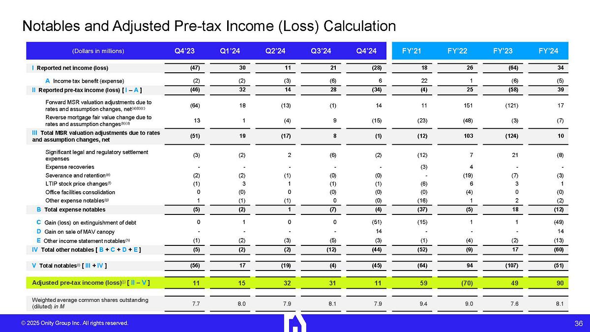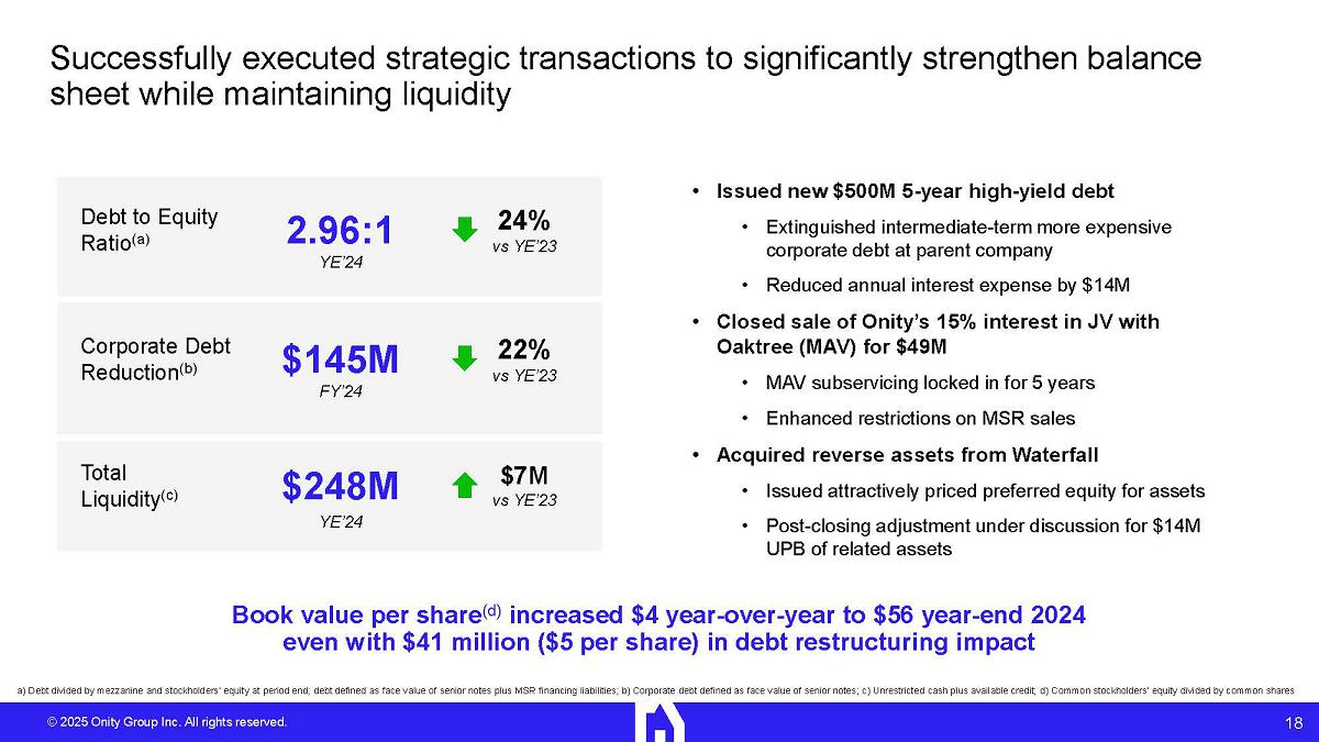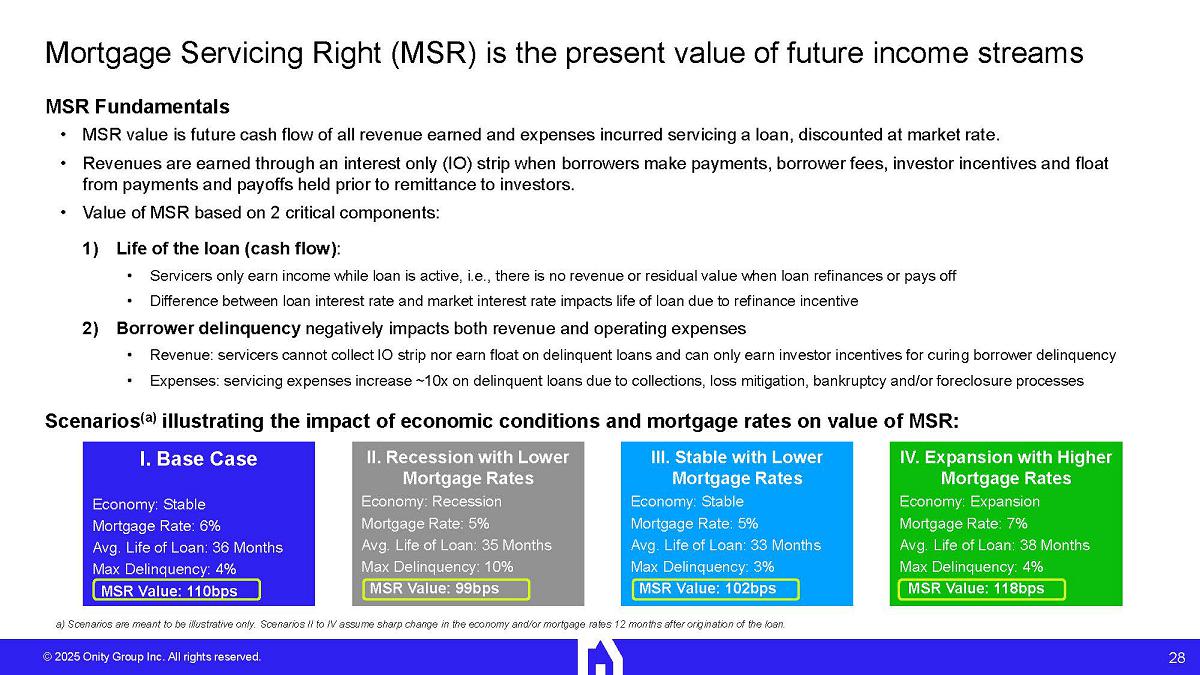 Forward-looking statements involve a number of assumptions, risks and uncertainties that could cause actual results to differ materially. In the past, actual results have differed from those suggested by forward looking statements and this may happen again. Important factors that could cause actual results to differ materially from those suggested by the forward-looking statements include, but are not limited to, the potential for ongoing disruption in the financial markets and in commercial activity generally as a result of U.S. and global political events, changes in monetary and fiscal policy, and other sources of instability; the impacts of inflation, employment disruption, and other financial difficulties facing our borrowers; the adequacy of our financial resources, including our sources of liquidity and ability to sell, fund and recover servicing advances, forward and reverse whole loans, future draws on existing reverse loans, and HECM and forward loan buyouts and put backs, as well as repay, renew and extend borrowings, borrow additional amounts as and when required, meet our MSR or other asset investment objectives and comply with our debt agreements, including the financial and other covenants contained in them; our ability to interpret correctly and comply with current or future liquidity, net worth and other financial and other requirements of regulators, the Federal National Mortgage Association (Fannie Mae), and Federal Home Loan Mortgage Corporation (Freddie Mac) (together, the GSEs), and the Government National Mortgage Association (Ginnie Mae), including our ability to implement a cost-effective response to Ginnie Mae’s risk-based capital requirements by the extended deadline granted to us by Ginnie Mae of September 30, 2025; our ability to timely reduce operating costs, or generate offsetting revenue, in proportion to the industry-wide decrease in originations activity; the impact of cost-reduction initiatives on our business and operations; the impact of our rebranding initiative; the amount of senior debt or common stock or that we may repurchase under any repurchase programs, the timing of such repurchases, and the long-term impact, if any, of repurchases on the trading price of our securities or our financial condition; breach or failure of Onity’s, our contractual counterparties’, or our vendors’ information technology or other security systems or privacy protections, including any failure to protect customers’ data, resulting in disruption to our operations, loss of income, reputational damage, costly litigation and regulatory penalties; our reliance on our technology vendors to adequately maintain and support our systems, including our servicing systems, loan originations and financial reporting systems, and uncertainty relating to our ability to transition to alternative vendors, if necessary, without incurring significant cost or disruption to our operations; the future of our long-term relationship with Rithm Capital Corp. (Rithm); our ability to close acquisitions of MSRs and other transactions, including the ability to obtain regulatory approvals; our ability to grow our reverse servicing business; our ability to retain clients and employees of acquired businesses, and the extent to which acquisitions and our other strategic initiatives will contribute to achieving our growth objectives; increased servicing costs based on increased borrower delinquency levels or other factors; uncertainty related to past, present or future claims, litigation, cease and desist orders and investigations regarding our servicing, foreclosure, modification, origination and other practices brought by government agencies and private parties, including state regulators, the Consumer Financial Protection Bureau (CFPB), State Attorneys General, the Securities and Exchange Commission (SEC), the Department of Justice or the Department of Housing and Urban Development (HUD); the reactions of key counterparties, including lenders, the GSEs and Ginnie Mae, to our regulatory engagements and litigation matters; increased regulatory scrutiny and media attention; any adverse developments in existing legal proceedings or the initiation of new legal proceedings; our ability to effectively manage our regulatory and contractual compliance obligations; our ability to comply with our servicing agreements, including our ability to comply with the requirements of the GSEs and Ginnie Mae and maintain our seller/servicer and other statuses with them; our ability to fund future draws on existing loans in our reverse mortgage portfolio; our servicer and credit ratings as well as other actions from various rating agencies, including any future downgrades; as well as other risks and uncertainties detailed in our reports and filings with the SEC, including our annual report on Form 10-K for the year ended December 31, 2024. Anyone wishing to understand Onity’s business should review our SEC filings. Our forward-looking statements speak only as of the date they are made and, we disclaim any obligation to update or revise forward-looking statements whether as a result of new information, future events or otherwise.