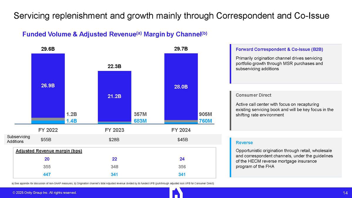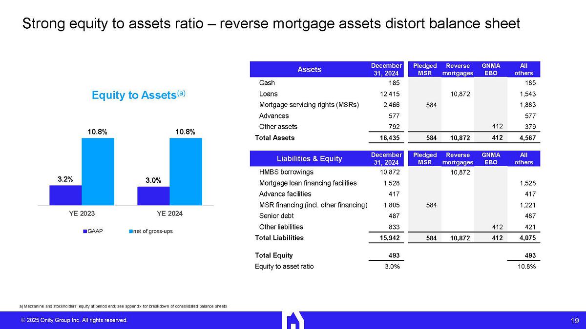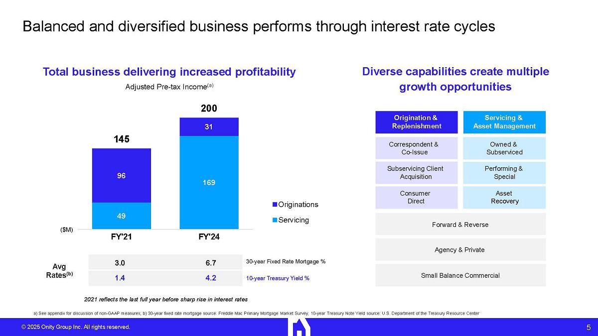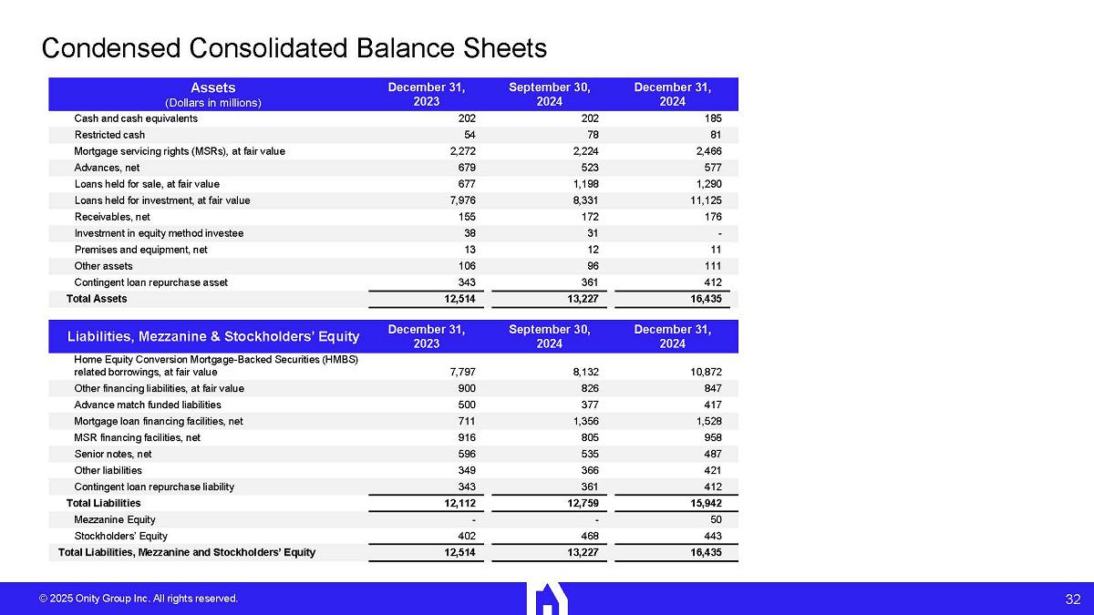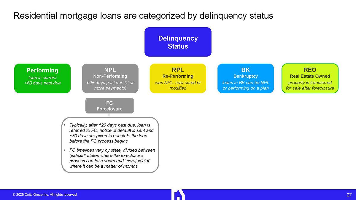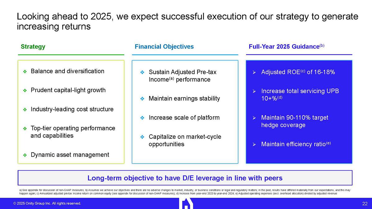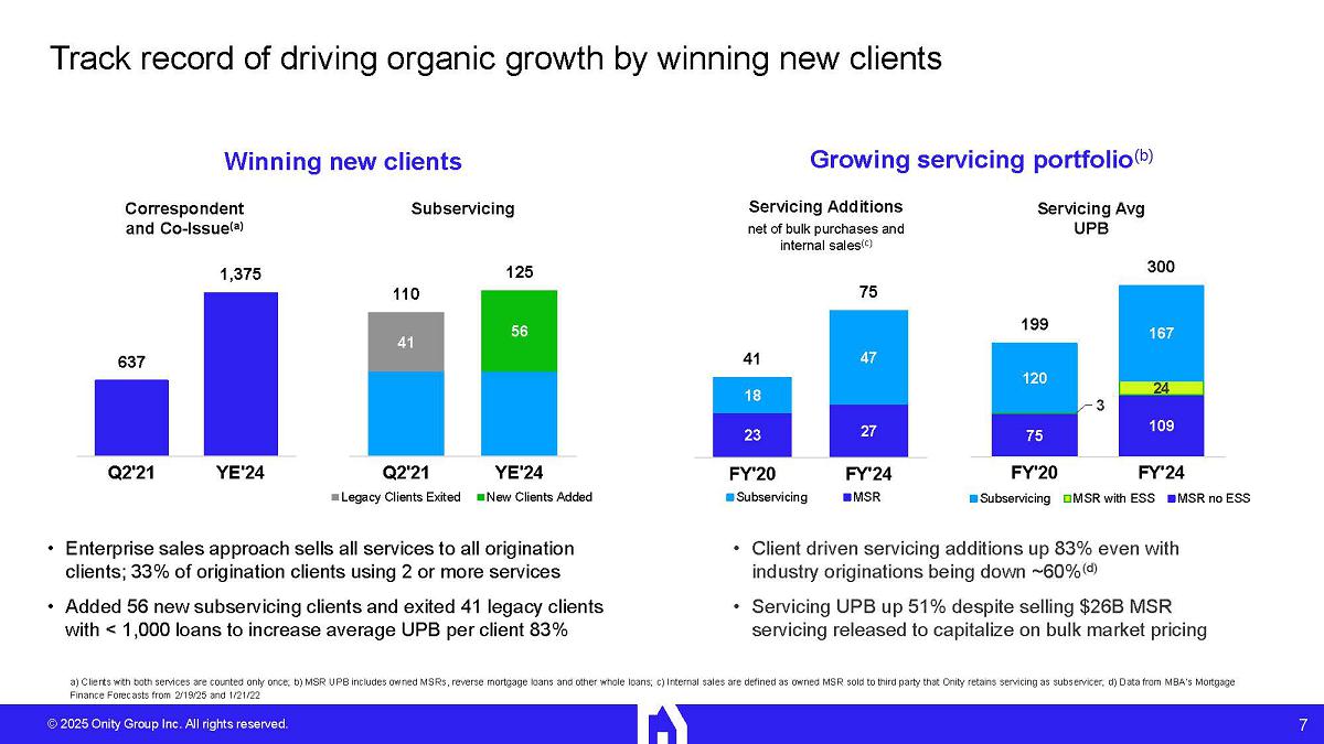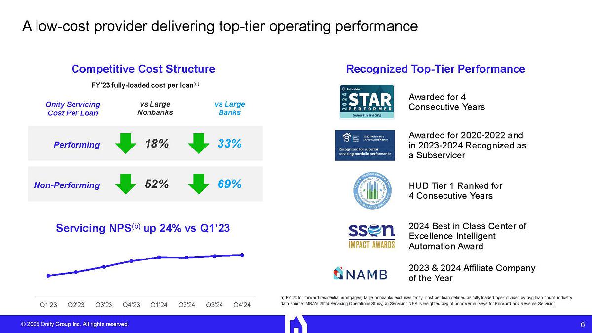 Forward-looking statements involve a number of assumptions, risks and uncertainties that could cause actual results to differ materially. In the past, actual results have differed from those suggested by forward looking statements and this may happen again. Important factors that could cause actual results to differ materially from those suggested by the forward-looking statements include, but are not limited to, the potential for ongoing disruption in the financial markets and in commercial activity generally as a result of U.S. and global political events, changes in monetary and fiscal policy, and other sources of instability; the impacts of inflation, employment disruption, and other financial difficulties facing our borrowers; the adequacy of our financial resources, including our sources of liquidity and ability to sell, fund and recover servicing advances, forward and reverse whole loans, future draws on existing reverse loans, and HECM and forward loan buyouts and put backs, as well as repay, renew and extend borrowings, borrow additional amounts as and when required, meet our MSR or other asset investment objectives and comply with our debt agreements, including the financial and other covenants contained in them; our ability to interpret correctly and comply with current or future liquidity, net worth and other financial and other requirements of regulators, the Federal National Mortgage Association (Fannie Mae), and Federal Home Loan Mortgage Corporation (Freddie Mac) (together, the GSEs), and the Government National Mortgage Association (Ginnie Mae), including our ability to implement a cost-effective response to Ginnie Mae’s risk-based capital requirements by the extended deadline granted to us by Ginnie Mae of September 30, 2025; our ability to timely reduce operating costs, or generate offsetting revenue, in proportion to the industry-wide decrease in originations activity; the impact of cost-reduction initiatives on our business and operations; the impact of our rebranding initiative; the amount of senior debt or common stock or that we may repurchase under any repurchase programs, the timing of such repurchases, and the long-term impact, if any, of repurchases on the trading price of our securities or our financial condition; breach or failure of Onity’s, our contractual counterparties’, or our vendors’ information technology or other security systems or privacy protections, including any failure to protect customers’ data, resulting in disruption to our operations, loss of income, reputational damage, costly litigation and regulatory penalties; our reliance on our technology vendors to adequately maintain and support our systems, including our servicing systems, loan originations and financial reporting systems, and uncertainty relating to our ability to transition to alternative vendors, if necessary, without incurring significant cost or disruption to our operations; the future of our long-term relationship with Rithm Capital Corp. (Rithm); our ability to close acquisitions of MSRs and other transactions, including the ability to obtain regulatory approvals; our ability to grow our reverse servicing business; our ability to retain clients and employees of acquired businesses, and the extent to which acquisitions and our other strategic initiatives will contribute to achieving our growth objectives; increased servicing costs based on increased borrower delinquency levels or other factors; uncertainty related to past, present or future claims, litigation, cease and desist orders and investigations regarding our servicing, foreclosure, modification, origination and other practices brought by government agencies and private parties, including state regulators, the Consumer Financial Protection Bureau (CFPB), State Attorneys General, the Securities and Exchange Commission (SEC), the Department of Justice or the Department of Housing and Urban Development (HUD); the reactions of key counterparties, including lenders, the GSEs and Ginnie Mae, to our regulatory engagements and litigation matters; increased regulatory scrutiny and media attention; any adverse developments in existing legal proceedings or the initiation of new legal proceedings; our ability to effectively manage our regulatory and contractual compliance obligations; our ability to comply with our servicing agreements, including our ability to comply with the requirements of the GSEs and Ginnie Mae and maintain our seller/servicer and other statuses with them; our ability to fund future draws on existing loans in our reverse mortgage portfolio; our servicer and credit ratings as well as other actions from various rating agencies, including any future downgrades; as well as other risks and uncertainties detailed in our reports and filings with the SEC, including our annual report on Form 10-K for the year ended December 31, 2024. Anyone wishing to understand Onity’s business should review our SEC filings. Our forward-looking statements speak only as of the date they are made and, we disclaim any obligation to update or revise forward-looking statements whether as a result of new information, future events or otherwise.