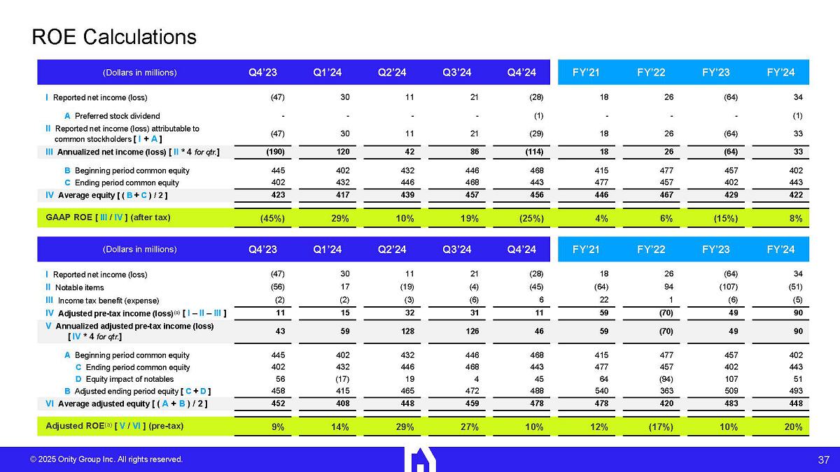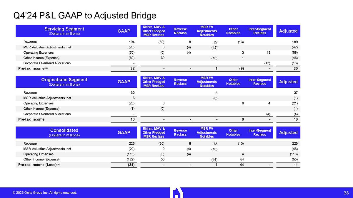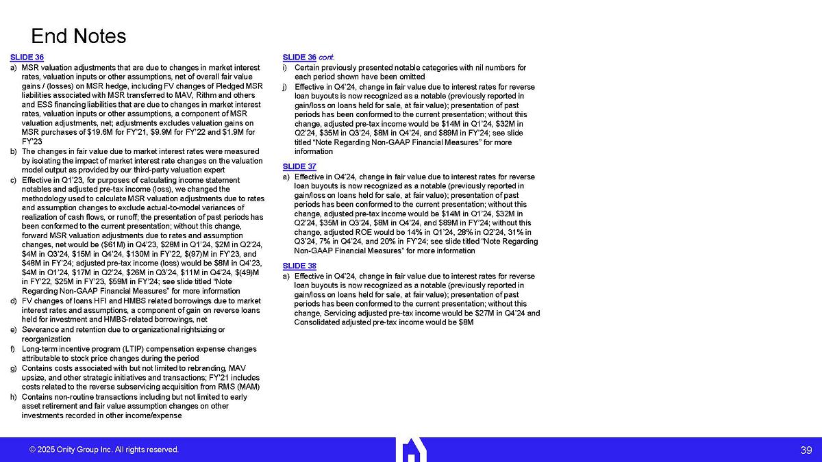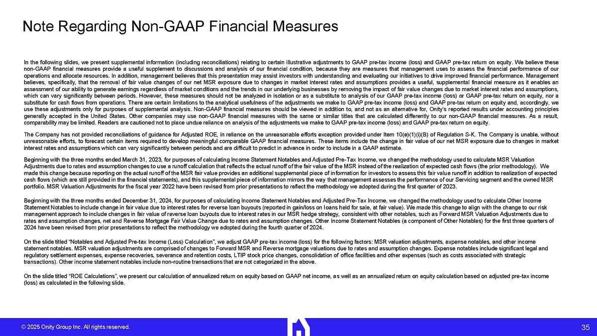 The attached presentation contains references to adjusted ROE, a non-GAAP financial measure. We believe this non-GAAP financial measure provides a useful supplement to discussions and analysis of our financial condition, because it is a measure that management uses to assess the financial performance of our operations and allocate resources. However, this measure should not be analyzed in isolation or as a substitute to analysis of our GAAP pre-tax ROE. There are certain limitations to the analytical usefulness of the adjustments we make to GAAP pre-tax ROE and, accordingly, we use these adjustments only for purposes of supplemental analysis. Non-GAAP financial measures should be viewed in addition to, and not as an alternative for, Onity’s reported results under accounting principles generally accepted in the United States. Other companies may use non-GAAP financial measures with the same or similar titles that are calculated differently to our non-GAAP financial measures. As a result, comparability may be limited. Readers are cautioned not to place undue reliance on analysis of the adjustments we make to GAAP pre-tax ROE.