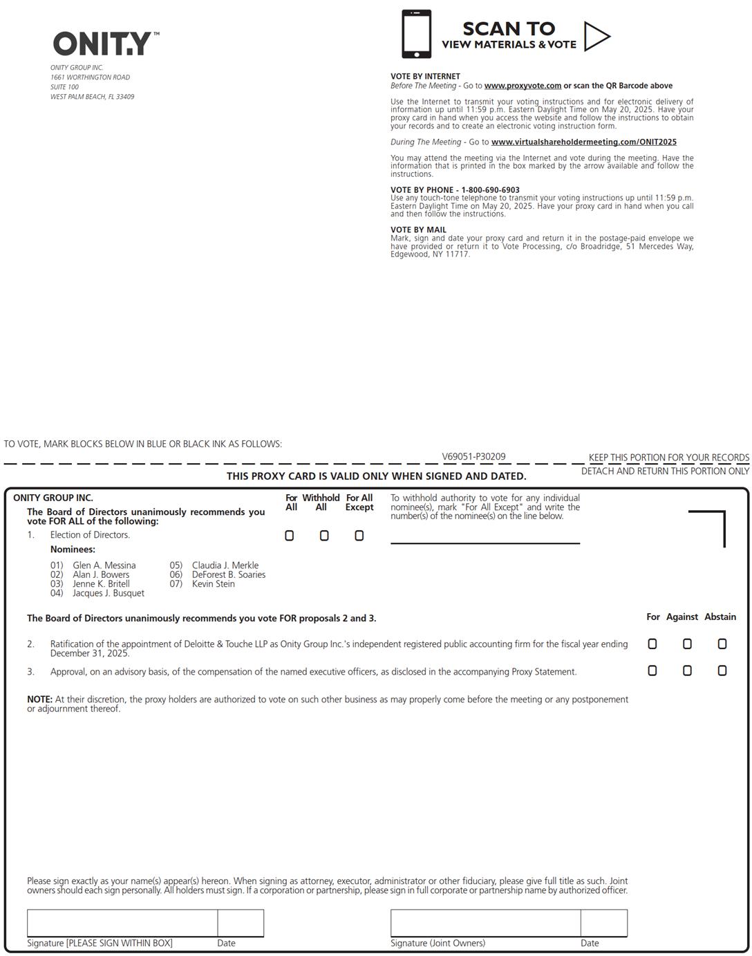 | ● | If you would like to attend the virtual meeting and you have your control number, please go to www.virtualshareholdermeeting.com/ONIT2025 15 minutes prior to the start of the meeting to log in. For shareholders who hold shares in street name, if you came through your brokerage firm’s website and do not have your control number, you can gain access to the meeting by logging into your brokerage firm’s website 15 minutes prior to the meeting start, selecting the shareholder communications mailbox to link through to the meeting and the control number will automatically populate. For technical assistance when logging into Onity’s Annual Meeting, please call 800-586-1548 (US) or 303-562-9288 (International). | |